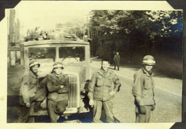 Soldiers in front of a military truck. (1945). Source: Veterans History Project, Bernard Horowitz.