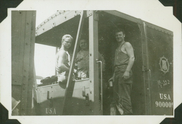 Soldiers in the cab of a locomotive traveling through Germany. (June, 1945). Source: Veterans History Project, Bernard Horowitz.