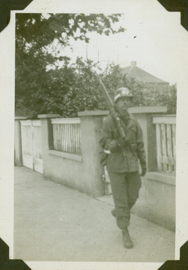 A soldier in uniform carrying a rifle. (June 1945). Source: Veterans History Project, Bernard Horowitz.