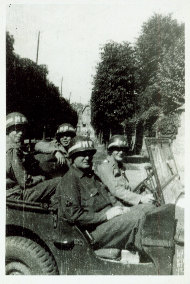 Four soldiers in a military Jeep in Versailles, France. (September 1945). Source: Veterans History Project, Bernard Horowitz.