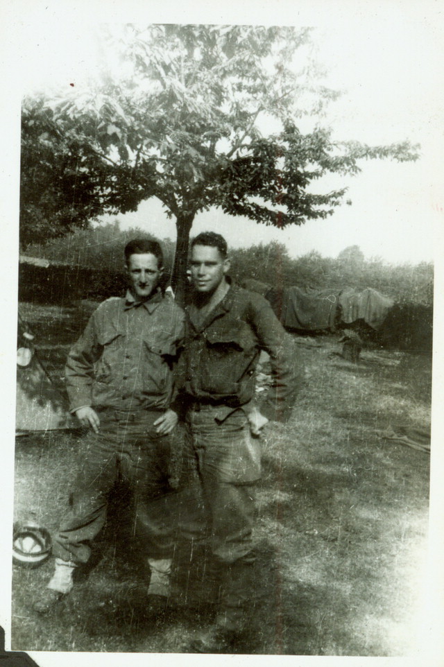 Two soldiers, Rickrode and Horowitz, at their camp in Millen, Belgium. (September 1944). Source: Veterans History Project, Bernard Horowitz.