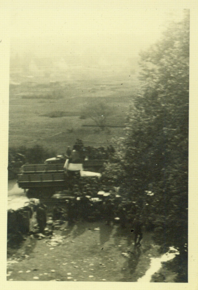 Military vehicle driving through Gladbach, Germany. (April 1945). Source: Veterans History Project, Bernard Horowitz.